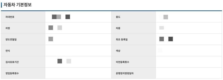 소유자 동의가 없을 때에도 기본 정보는 물론이고, 검사이력, 정비 이력 횟수, 압류, 저당 등 차량에 대한 전반적인 내용을 모두 확인할 수 있습니다.